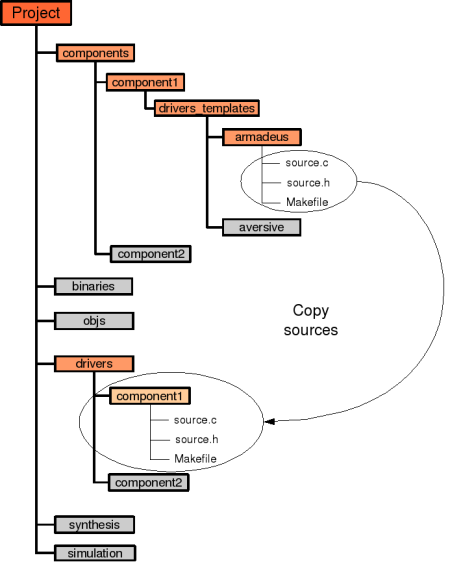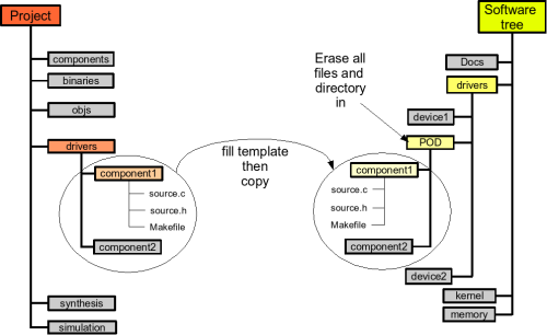 • selection of the template source code depending on the targeted operating system. The template located in the drivers/ directory of a component is copied in the drivers/ directory of the project
