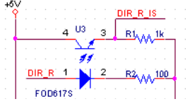 The protection and voltage translation stage is done by using optocouplers. There are small devices that contain a diode and a photo-transistor. When the diode emits light, the photo-transistor becomes saturated and the logic level at its output is pulled high. Otherwise, the transistor is blocked and the logic level is low. The main advantage is to not have any electrical link between the input and the output. So if a short-circuit happens, the optocouplers might be destroyed but not the logic behind it. The illustration bellow presents how optocouplers are polarized on the motor board. The reference used is FOD617 from Fairchild semiconductor.