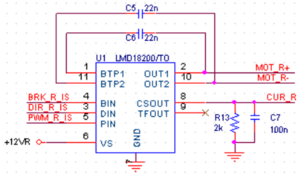 The main devices that drive the motors are two full H-bridge drivers. These devices allow the motor to turn backward or forward at different speeds (controlled by using a Pulse Width Modulation – PWM). The chosen devices are the LMD18200 from National Semiconductor. They can drive 3A and have a current sensing output. Two capacitors are simply connected between outputs and boostraps pins, as shown on the figure below.