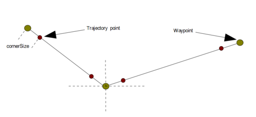 The second function is an enhancement of the previous one, instead of turning on place at each waypoint the robot can make a complex move (rotation+translation) in order to “round” the corners. The function pathStraightRoundCorners() takes the same parameters as previously plus the corner size radius. The two points computed for the same waypoints are now shifted from the corner size radius along the previous and next direction respectively, as shown on the illustration bellow.