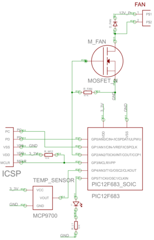 A small dedicated microcontroller is used to realize this function, which again has been chosen from the Microchip manufacturer. It is a PIC12F683 which is small (8 pins), has got an ADC for the temperature reading and a PWM output for the fan speed setting.