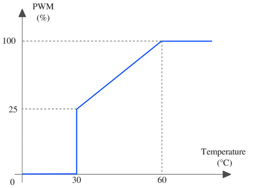 • between 30°C and 60°C the speed of the fan is linearly increasing according the temperature. An initial offset is required to start the fan’s motor.