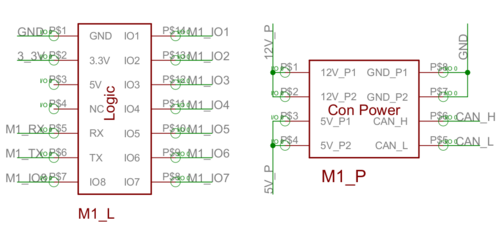 Each module can access to a 5V and 12V power supply generated from the power board, and a 3.3V logic supply generated by the daughter board. It also has the possibility to use the CAN bus or an UART from the PIC32MX.