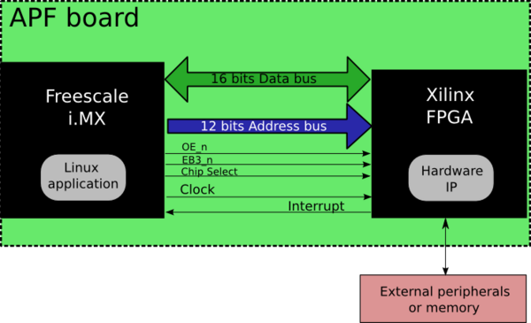 The FPGA on the APF is connected to the i.MX processor busses (data & address) and to the APF Hirose connectors. This makes it possible to design your own peripherals and to put them into the FPGA. Because the FPGA can be reconfigured at any time, it allows you to replace these peripherals (or a part of them) in-situ (if other functionalities are needed, for example). This is even possible at run-time !