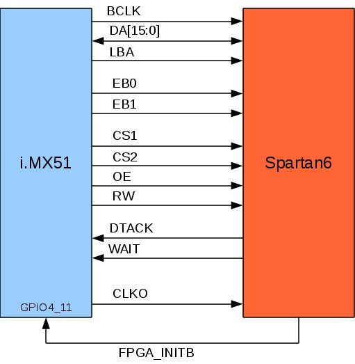 This article describe the bus interface configuration to communicate between i.MX51 processor and Spartan6 FPGA. In i.MX51, the bus used to make communication with the FPGA is named WEIM for Wireless Extension Interface Module. All description of this bus can be found under the i.MX51 reference manual in chapter 63 (page 3113).