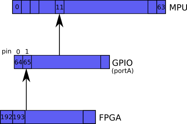 We will declare IT 65 as a chained IRQ (if possible as it's already a virtual interrupt of IT 11) and add a demultiplexer for FPGA in the IRQ handler. This way usable IT numbers for IP will be in the range [192-255?].